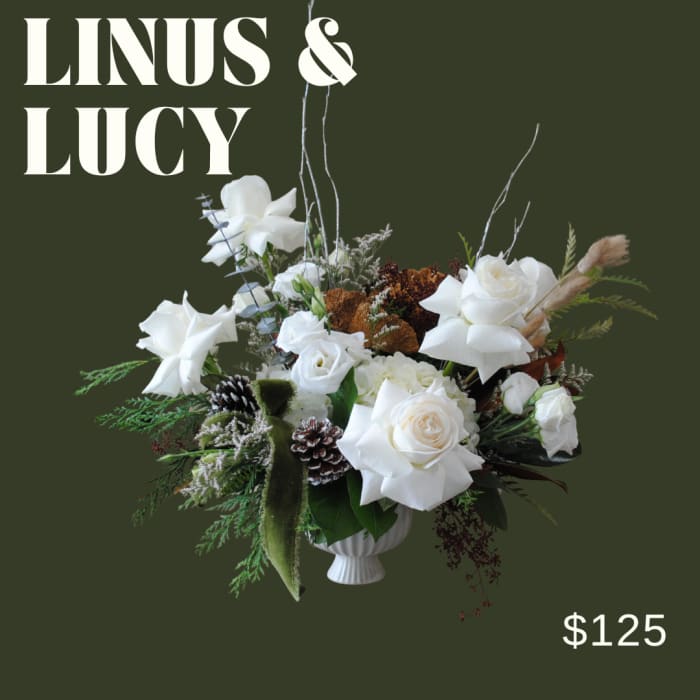 Price: $125.00Linus & Lucy- White and green holiday arrangement